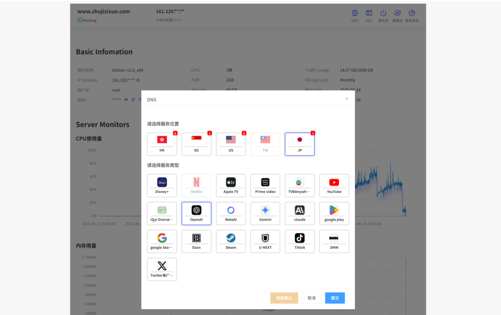 JP1 CO已上线的自选DNS UNLOCK服务,后续应该也会同步支持该区域,目前已支持JP1 CO和HK Jinx。